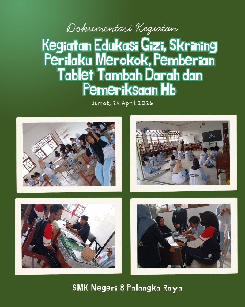 Rangkaian kegiatan kesehatan ini mencakup berbagai layanan preventif dan edukatif, mulai dari pemberian edukasi gizi untuk mendorong pola hidup sehat hingga pelaksanaan pemeriksaan kadar Hemoglobin (HB) guna mendeteksi gejala anemia sejak dini. Selain itu, dilakukan pula pemberian Tablet Tambah Darah serta skrining perilaku merokok sebagai langkah komprehensif dalam memantau kesehatan fisik dan perilaku remaja. Melalui kolaborasi profesional ini, SMKN 8 Palangka Raya berkomitmen untuk menciptakan lingkungan pendidikan yang tidak hanya unggul secara akademis, tetapi juga didukung oleh kondisi fisik siswa yang prima dan sehat.